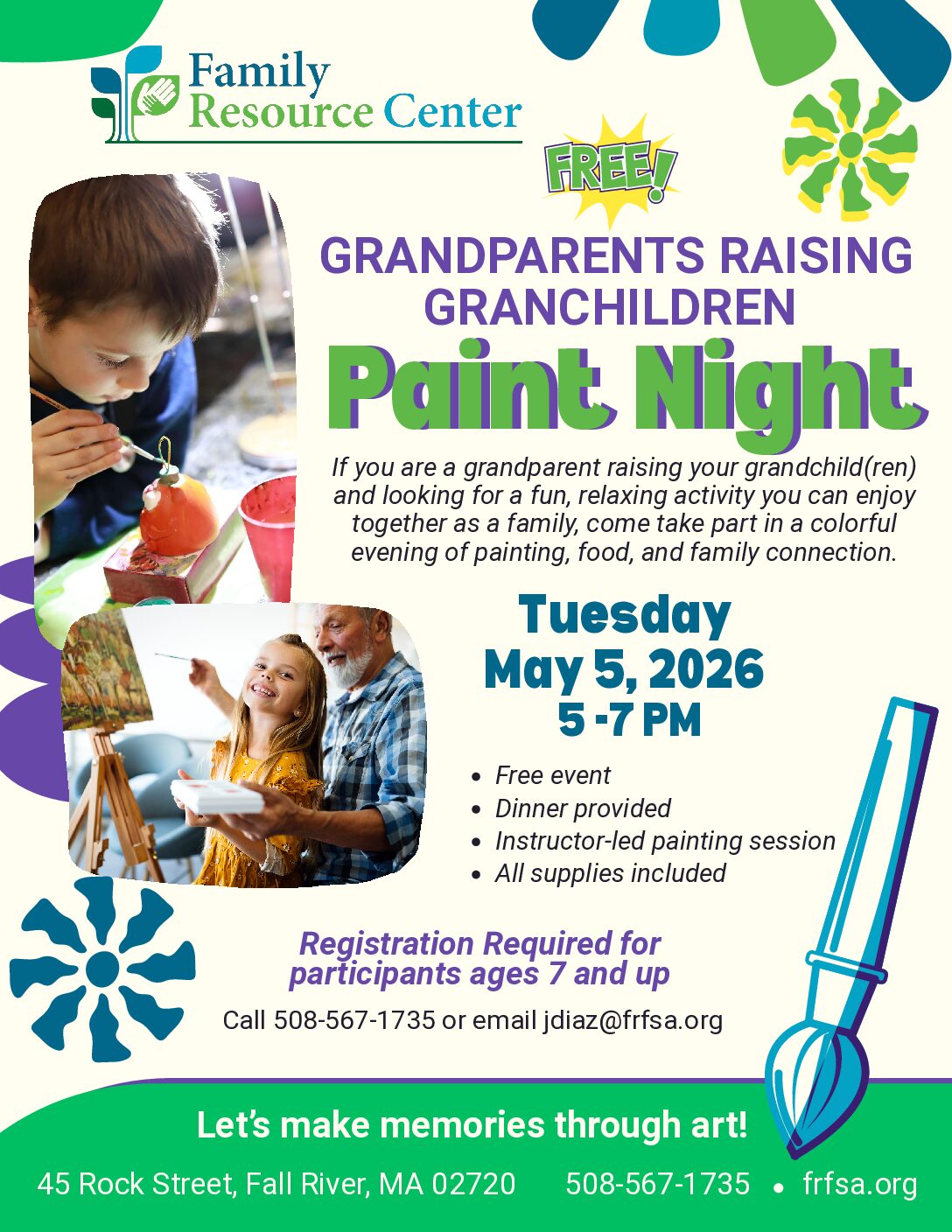 Guided painting for all Grandparents Raising Grandchildren. Please join us in this fun-filled painting activity. -Free event for ages 7+. MUST Register! Please contact the Family Resource Center at 508-567-1735. Dinner and childcare will be provided as well.